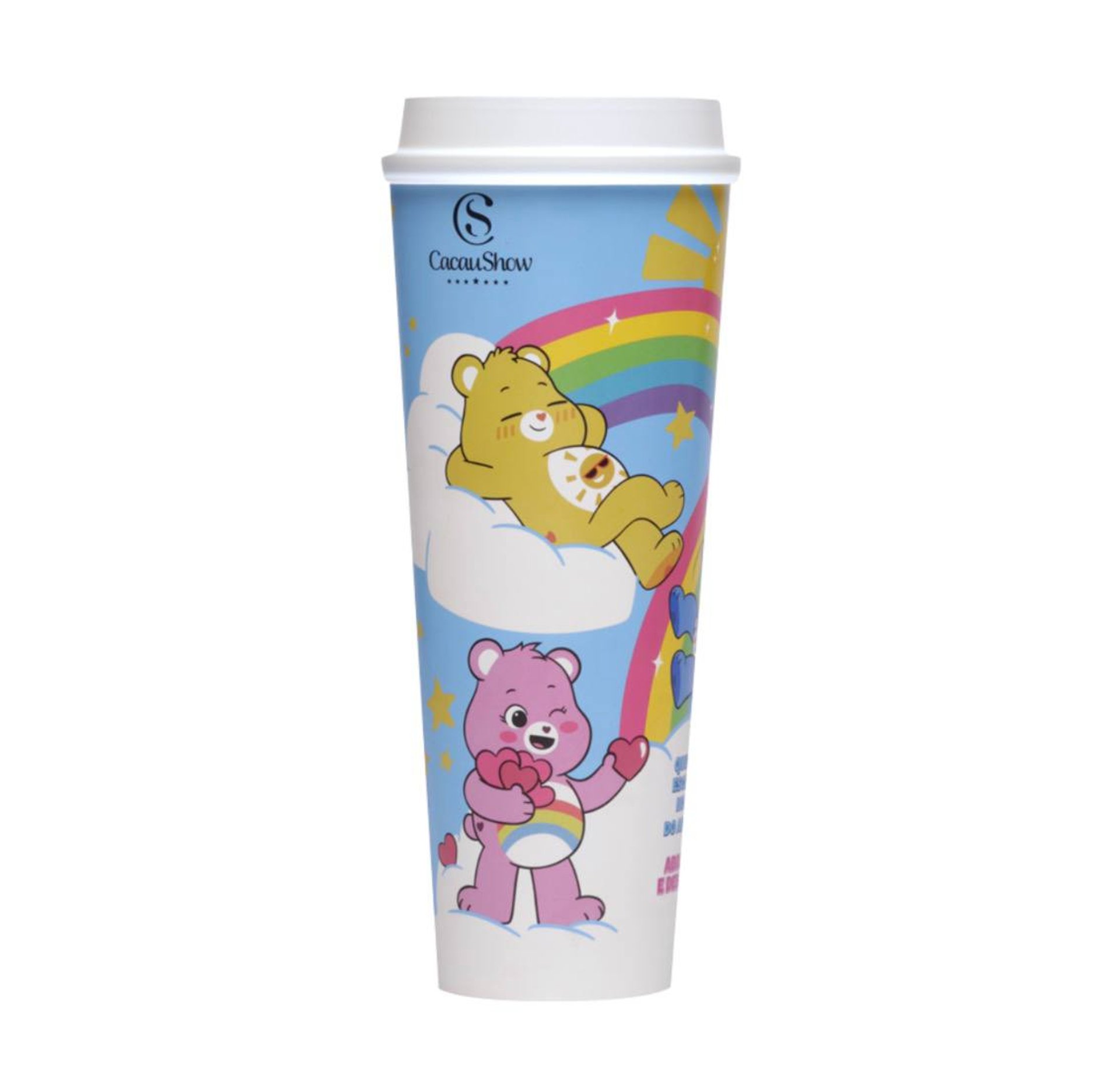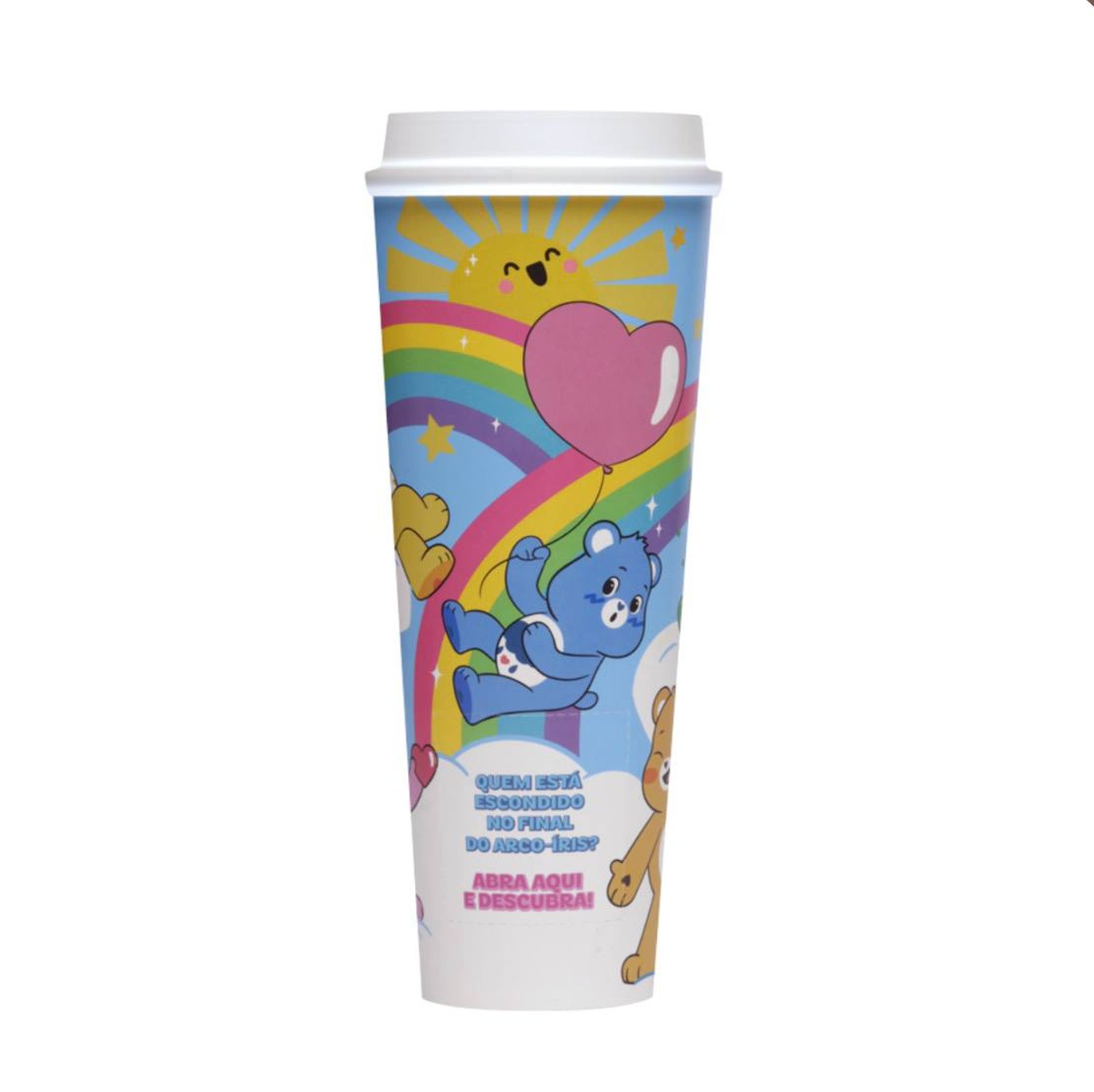 Um copo especial que acompanha uma deliciosa bebidade leite com chocolate cremoso e chantilly, disponível nas opções quente ou gelada. Vem com um chaveiro de pelúcia surpresa dos Ursinhos Carinhosos.